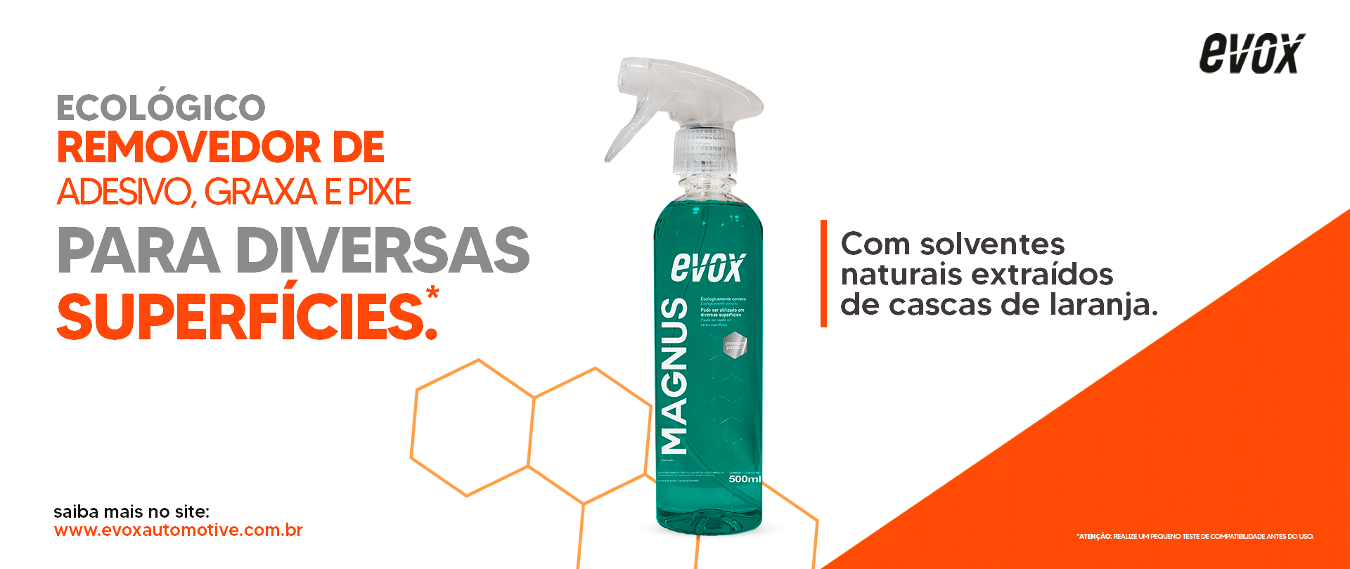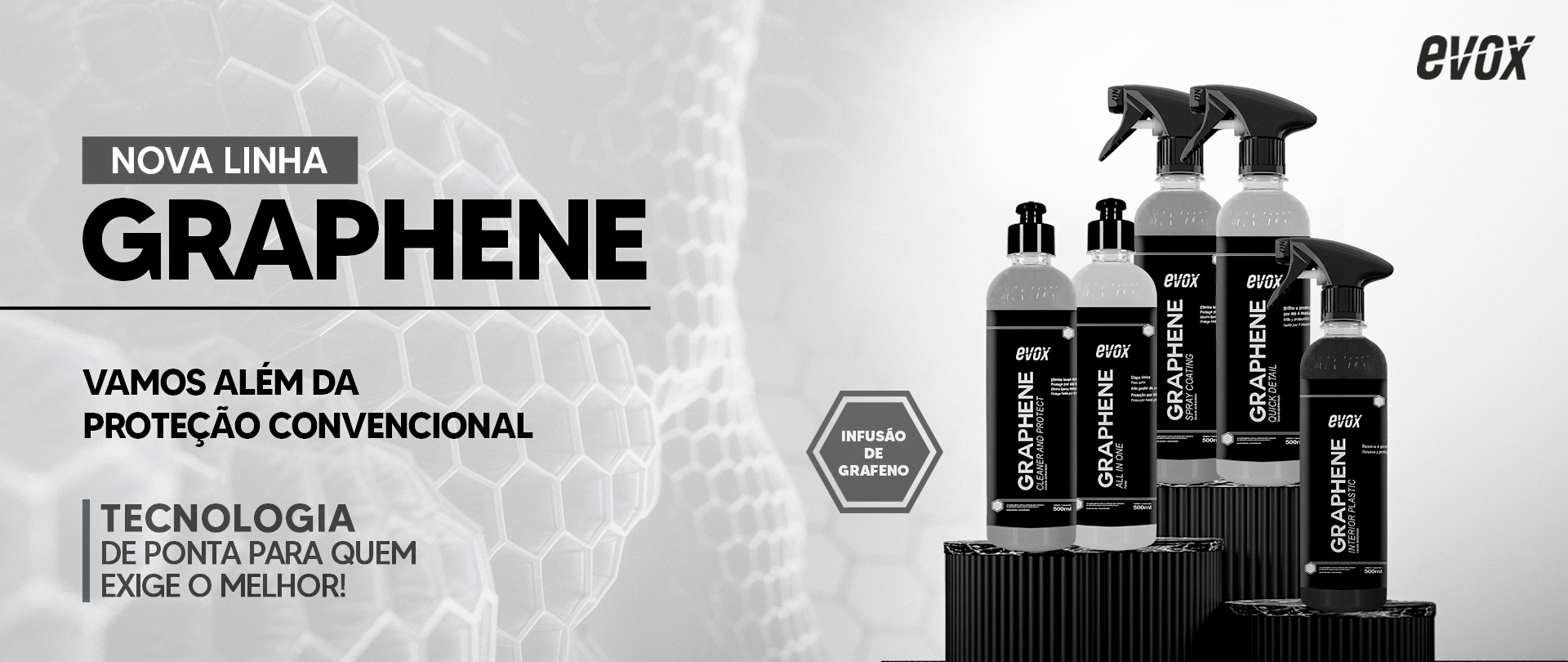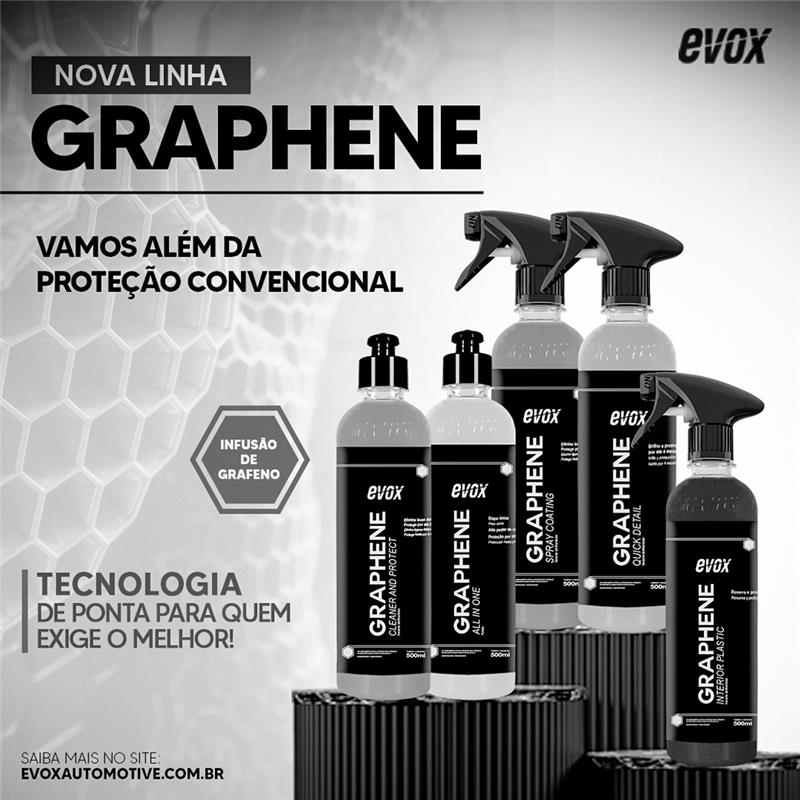 Um novo olhar, uma nova voz. A evolução ousada do mercado de estética automotiva. A Evox traz à tona a evolução do car care, contemplando em sua linha de produtos soluções para as mais diversas partes do carro, desde o externo aos detalhes internos do veículo. Os produtos, desenvolvidos com tecnologia de ponta, estão além do que hoje é encontrado no mercado e oferecem muito mais do que uma simples relação de compra-uso: surpreendem no cuidado e manutenção do veículo como um todo, seja por profissionais ou entusiastas.